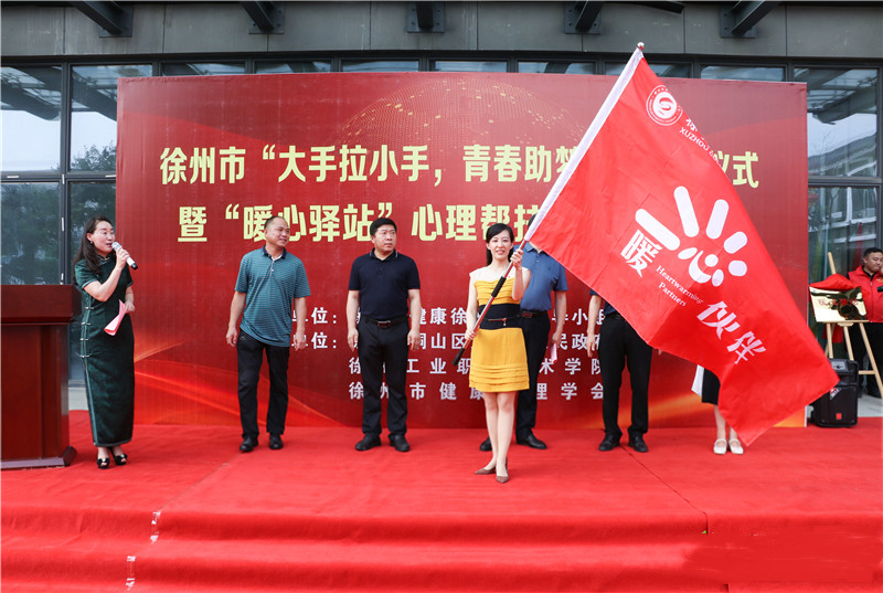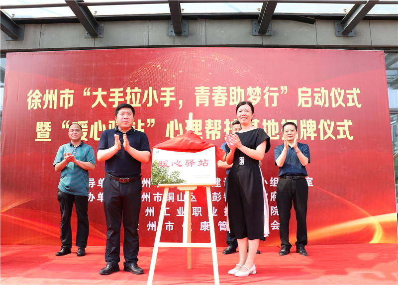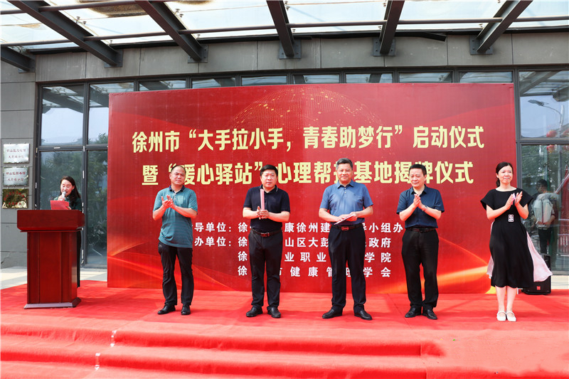 为全面落实健康中国行动——儿童青少年心理健康行动方案、国家义务教育薄弱环节改善与能力提升重大项目,加快实施“健康徐州2030”规划纲要心理健康促进行动,7月14日下午,由徐州市健康徐州建设领导小组办公室指导,徐州工业职业技术学院、徐州市铜山区大彭镇人民政府、徐州市健康管理学会主办的徐州市“大手拉小手,青春助梦行”启动仪式暨“暖心驿站”心理帮扶基地揭牌在大彭镇文体站举行。徐州市卫生健康委健康促进处处长、市爱卫办主任、徐州市健康管理学会顾问曹配亮,徐州市铜山区大彭镇党委书记陈琦,徐州工业职业技术学院团委书记安莹,徐州市爱卫办副主任汤元军,以及我校“暖心伙伴”团队和大彭镇的小朋友、部分媒体代表参加了启动仪式。